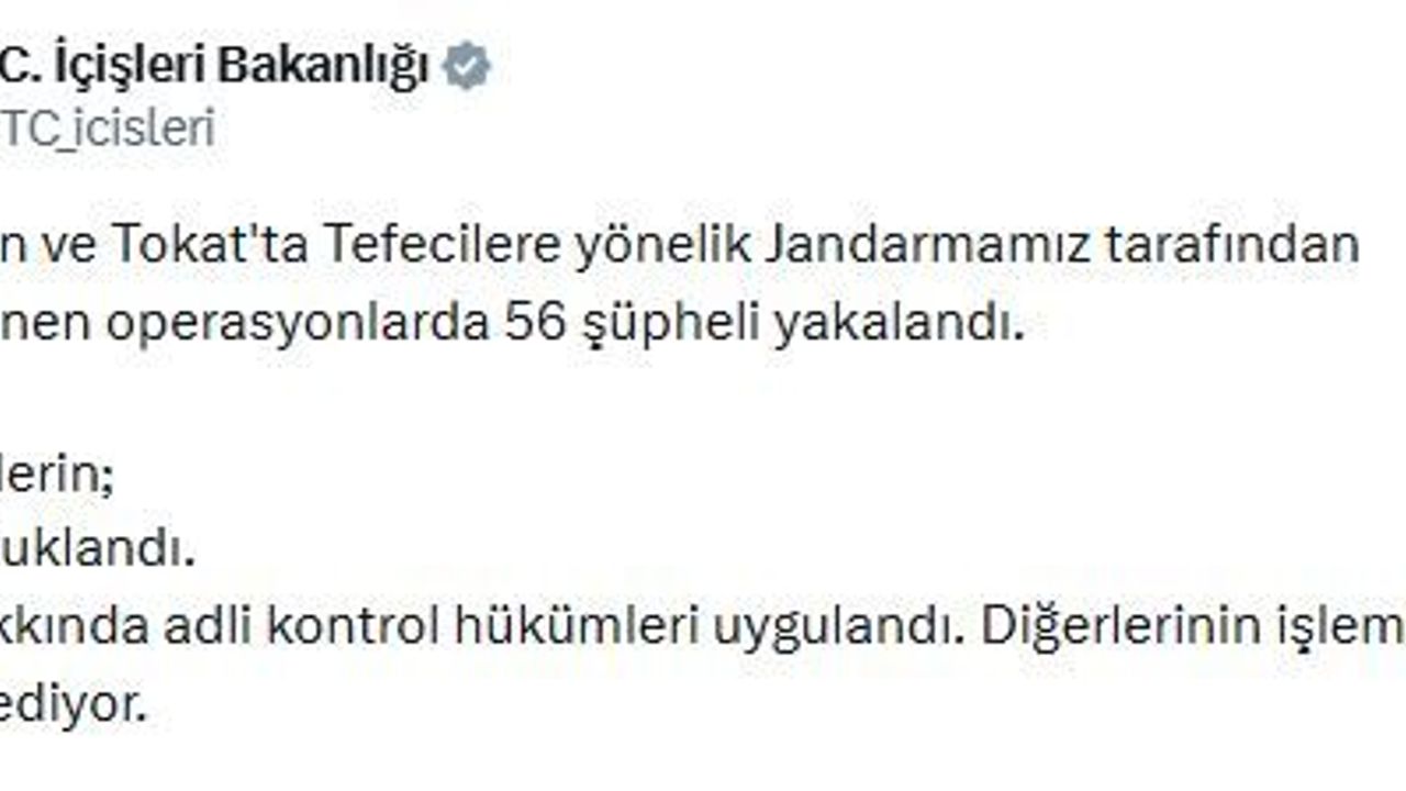 Bakanlığın sanal medya hesabından yapılan açıklamaya göre; Karaman ve Tokat'ta tefecilere yönelik jandarma tarafından yapılan operasyonlarda 56 şüpheli yakalandı. Şüphelilerin 25'i tutuklandı, 18'i hakkında adli kontrol hükümleri uygulandı. Diğerlerinin işlemleri sürüyor.