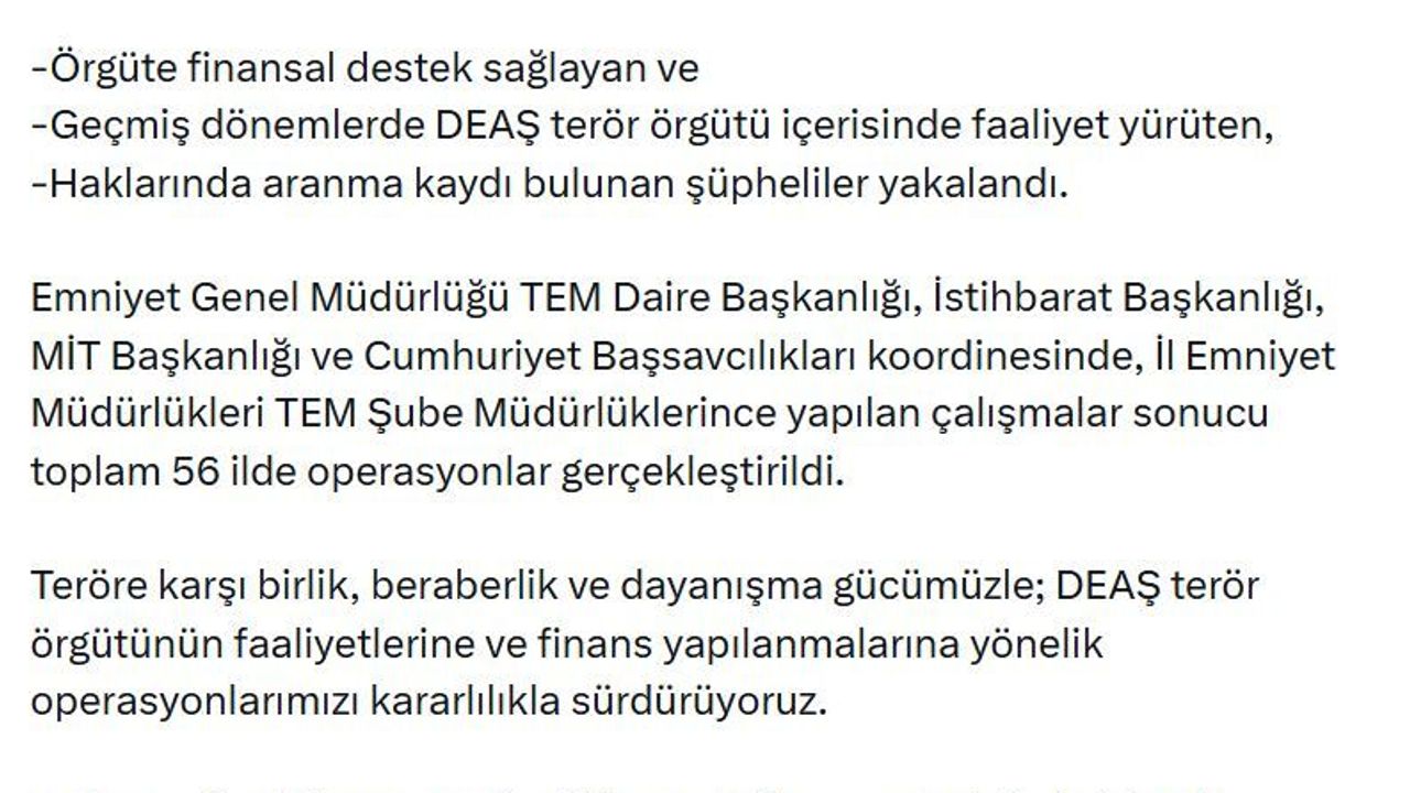 Bakanlığın sanal medya hesabından yapılan açıklamaya göre; Emniyet Genel Müdürlüğü TEM Daire Başkanlığı, İstihbarat Başkanlığı, MİT Başkanlığı ve Cumhuriyet başsavcılıkları koordinesinde 56 ilde DEAŞ terör örgütüne yönelik operasyonlar gerçekleştirildi. Örgüte finansal destek sağlayan ve geçmiş dönemlerde terör örgütü içerisinde faaliyet yürüten, haklarında aranma kaydı bulunan 525 şüpheli yakalandı.