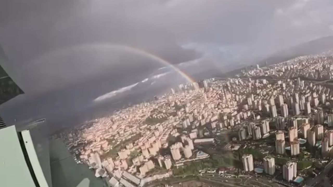 Yağmurun ardından güneşin açmasıyla gökkuşağı oluştu. Gökkuşağını gören vatandaşlar, o anları cep telefonu kamerasıyla kaydetti.