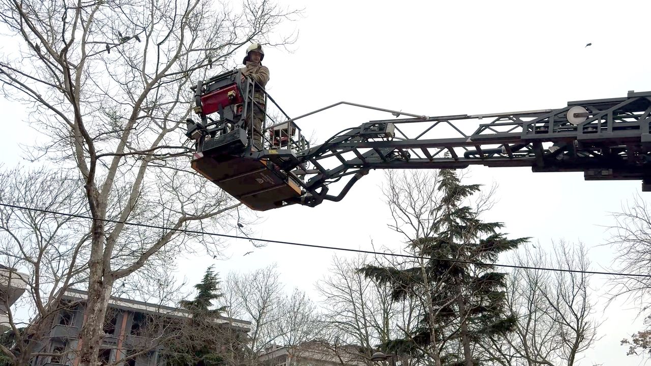 Ağaçta güvercinin ayağına ip dolandığını ve çırpındığını görenler, durumu 112 Acil Çağrı Merkezi'ne bildirdi. İhbar ile olay yerine itfaiye ekipleri sevk edildi. Sepetli araçla ağaca çıkan itfaiye erlerinden biri, mahsur kalan güvercine ulaşarak bir eliyle hayvanı tuttu, diğer eliyle de ayağına dolanan ipi kesti. Kurtarılan güvercin daha sonra serbest bırakıldı.