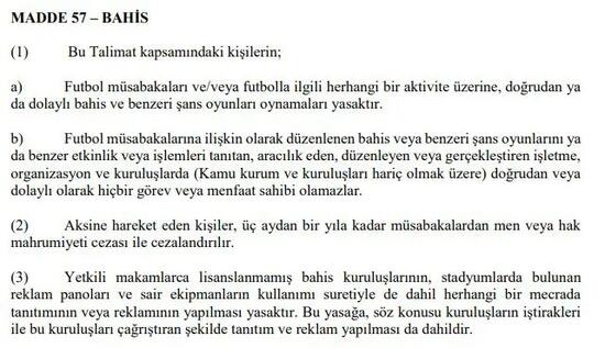 TFF’nin sevk gerekçesi olan Futbol Disiplin Talimatı’nın 57. maddesi, futbolcuların bahisle ilişkili her türlü faaliyetten uzak durmasını zorunlu kılıyor.