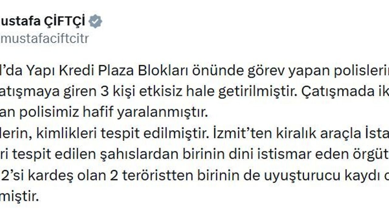 Bakan Çiftçi, sosyal medya hesabından yaptığı açıklamada, "İstanbul'da Yapı Kredi Plaza Blokları önünde görev yapan polislerimizle silahlı çatışmaya giren 3 kişi etkisiz hale getirilmiştir. Çatışmada iki kahraman polisimiz hafif yaralanmıştır" ifadelerine yer verdi.