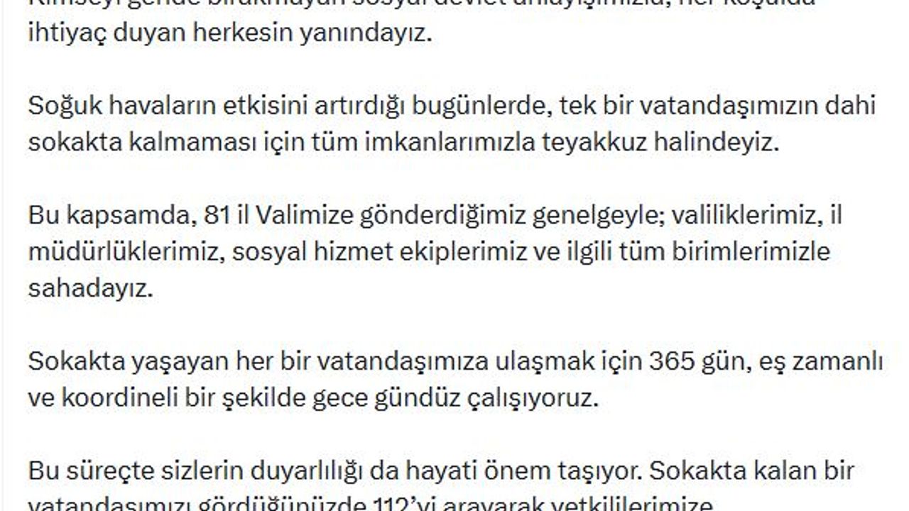 Bakan Göktaş, sosyal medya hesabından yaptığı açıklamada, 'Kimseyi geride bırakmayan sosyal devlet anlayışımızla, her koşulda ihtiyaç duyan herkesin yanındayız. Soğuk havaların etkisini artırdığı bugünlerde, tek bir vatandaşımızın dahi sokakta kalmaması için tüm imkanlarımızla teyakkuz halindeyiz. Bu kapsamda, 81 il valimize gönderdiğimiz genelgeyle; valiliklerimiz, il müdürlüklerimiz, sosyal hizmet ekiplerimiz ve ilgili tüm birimlerimizle sahadayız. Sokakta yaşayan her bir vatandaşımıza ulaşmak için 365 gün, eş zamanlı ve koordineli bir şekilde gece gündüz çalışıyoruz. Bu süreçte sizlerin duyarlılığı da hayati önem taşıyor. Sokakta kalan bir vatandaşımızı gördüğünüzde 112'yi arayarak yetkililerimize bildirebilirsiniz' dedi.
