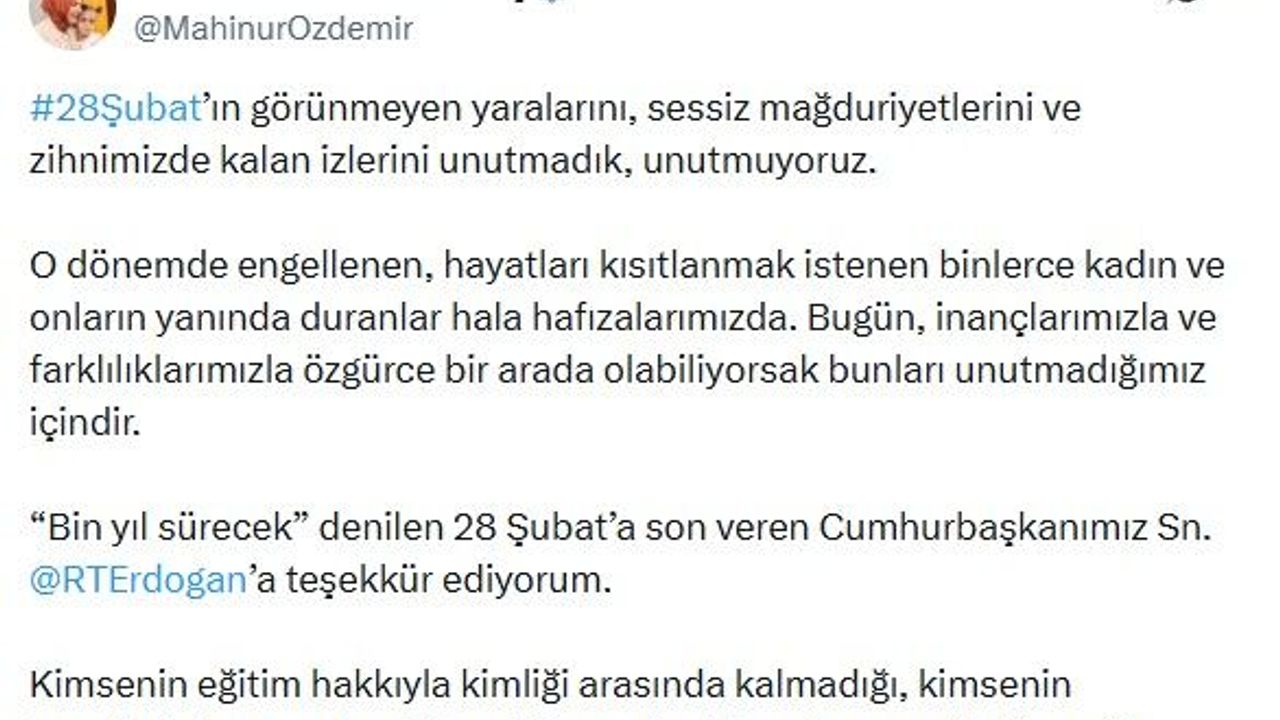 Bakan Göktaş, sosyal medya hesabından yaptığı paylaşımda, '28 Şubat'ın görünmeyen yaralarını, sessiz mağduriyetlerini ve zihnimizde kalan izlerini unutmadık, unutmuyoruz. O dönemde engellenen, hayatları kısıtlanmak istenen binlerce kadın ve onların yanında duranlar hala hafızalarımızda. Bugün, inançlarımızla ve farklılıklarımızla özgürce bir arada olabiliyorsak bunları unutmadığımız içindir. 'Bin yıl sürecek' denilen 28 Şubat'a son veren Cumhurbaşkanımız Sayın Recep Tayyip Erdoğan'a teşekkür ediyorum. Kimsenin eğitim hakkıyla kimliği arasında kalmadığı, kimsenin hayallerinin yarım bırakılmadığı yarınlar için çalışmayı sürdüreceğiz' dedi.