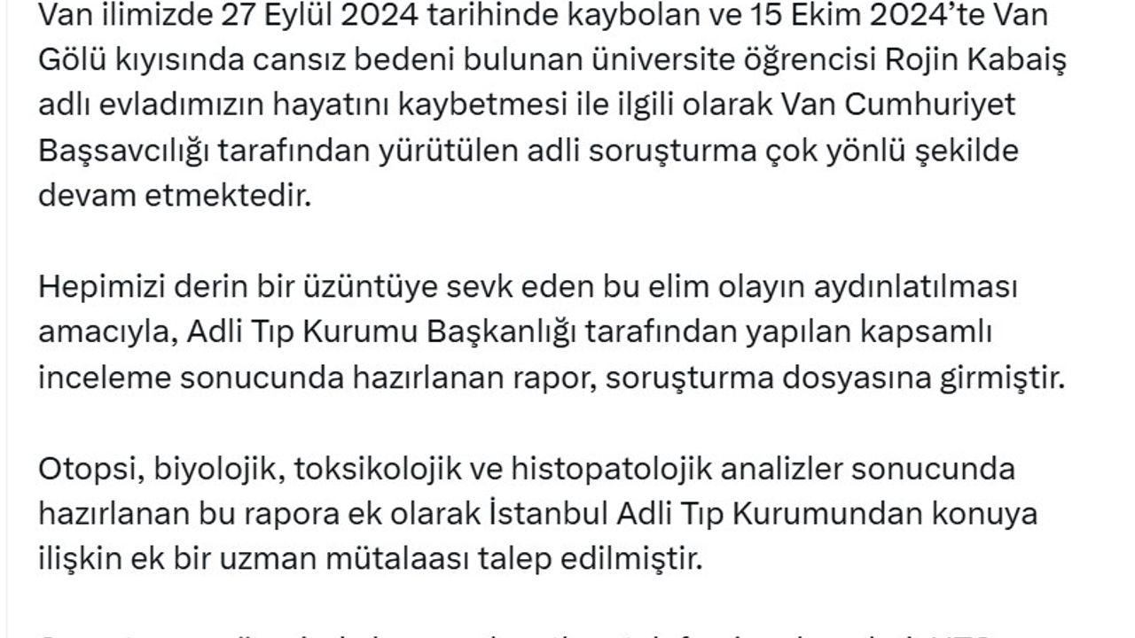 Adalet Bakanı Yılmaz Tunç, 27 Eylül 2024 tarihinde kaybolduktan sonra, 15 Ekim 2024'te Van Gölü kıyısında cansız bedeni bulunan Rojin Kabaiş'in ölümüne ilişkin soruşturmayla ilgili, sosyal medya hesabından açıklama yaptı. Bakan Tunç, "Van ilimizde 27 Eylül 2024 tarihinde kaybolan ve 15 Ekim 2024'te Van Gölü kıyısında cansız bedeni bulunan üniversite öğrencisi Rojin Kabaiş adlı evladımızın hayatını kaybetmesi ile ilgili olarak Van Cumhuriyet Başsavcılığı tarafından yürütülen adli soruşturma çok yönlü şekilde devam etmektedir. Hepimizi derin bir üzüntüye sevk eden bu elim olayın aydınlatılması amacıyla Adli Tıp Kurumu Başkanlığı tarafından yapılan kapsamlı inceleme sonucunda hazırlanan rapor, soruşturma dosyasına girmiştir. Otopsi, biyolojik, toksikolojik ve histopatolojik analizler sonucunda hazırlanan bu rapora ek olarak İstanbul Adli Tıp Kurumu’ndan konuya ilişkin ek bir uzman mütalaası talep edilmiştir. Soruşturma sürecinde kamera kayıtları, telefon incelemeleri, HTS dökümleri ve tanık ifadeleri de detaylı biçimde değerlendirilmiş, evladımızın kullandığı telefonun kilidinin açılması için yurt dışından uzmanların da dahil olduğu teknik çalışma ve bazı dijital materyallerin incelemeleri devam etmektedir. Soruşturma kapsamında, hiçbir ayrıntı göz ardı edilmeden bütün deliller ve raporlar derinlemesine incelenmekte, yargı makamlarının koordinasyonunda tüm süreç titizlikle yürütülmektedir. Başta Rojin evladımızın acılı ailesi olmak üzere milletimiz müsterih olsun; soruşturmada tek bir nokta dahi karanlıkta kalmadan maddi gerçeğin mutlaka ortaya çıkarılması için yoğun bir gayret gösterilmektedir. Rojin evladımıza bir kez daha Allah'tan rahmet, ailesine ve yakınlarına sabırlar diliyorum" dedi.