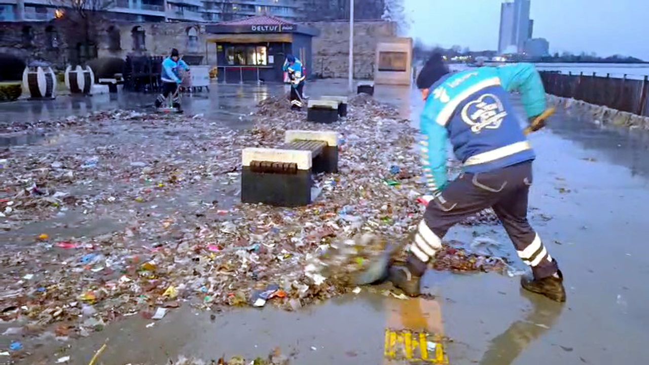 İstanbul geneşlinde etkili olan lodos denizdeki atıkların sahile taşınmasına neden oldu.