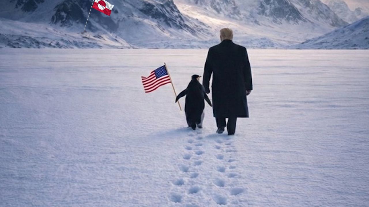 Beyaz Saray'ın sosyal medya hesabından, ABD Başkanı Donald Trump'ın yanında Amerikan bayrağını tutan bir penguenle Grönland'a doğru ilerlerken tasvir edildiği, yapay zeka tarafından oluşturulmuş bir görsel yayınlandı. Paylaşımda, 'Pengueni kucaklayın' denildi.