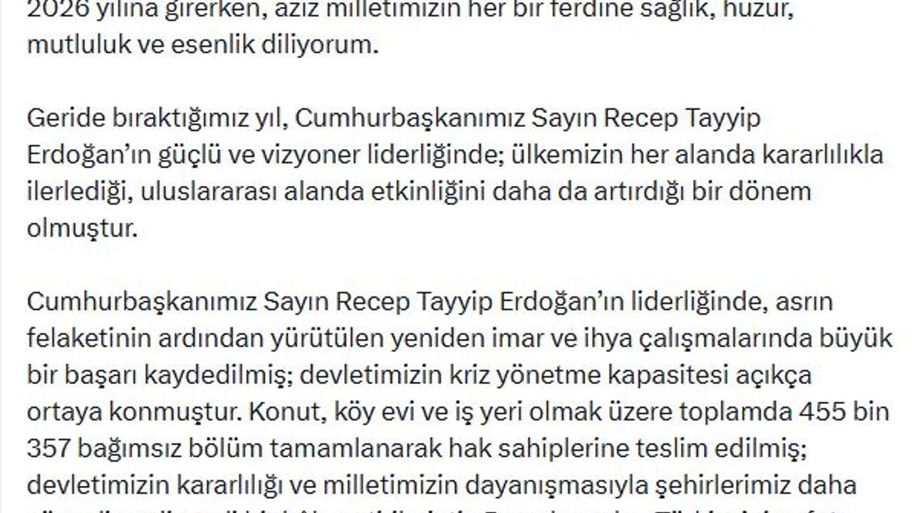 İletişim Başkanı Burhanettin Duran, sosyal medya hesabından yeni yıl mesajı yayımladı. Duran, paylaşımında, '2026 yılına girerken, aziz milletimizin her bir ferdine sağlık, huzur, mutluluk ve esenlik diliyorum. Geride bıraktığımız yıl, Cumhurbaşkanımız Sayın Recep Tayyip Erdoğan'ın güçlü ve vizyoner liderliğinde; ülkemizin her alanda kararlılıkla ilerlediği, uluslararası alanda etkinliğini daha da artırdığı bir dönem olmuştur. Cumhurbaşkanımız Sayın Recep Tayyip Erdoğan'ın liderliğinde, asrın felaketinin ardından yürütülen yeniden imar ve ihya çalışmalarında büyük bir başarı kaydedilmiş, devletimizin kriz yönetme kapasitesi açıkça ortaya konmuştur. Konut, köy evi ve iş yeri olmak üzere toplamda 455 bin 357 bağımsız bölüm tamamlanarak hak sahiplerine teslim edilmiş, devletimizin kararlılığı ve milletimizin dayanışmasıyla şehirlerimiz daha güvenli ve dirençli bir hale getirilmiştir. Bu çalışmalar, Türkiye'nin afet yönetimindeki gücünü ve devlet-millet el ele anlayışını bir kez daha göstermiştir' ifadelerine yer verdi.
