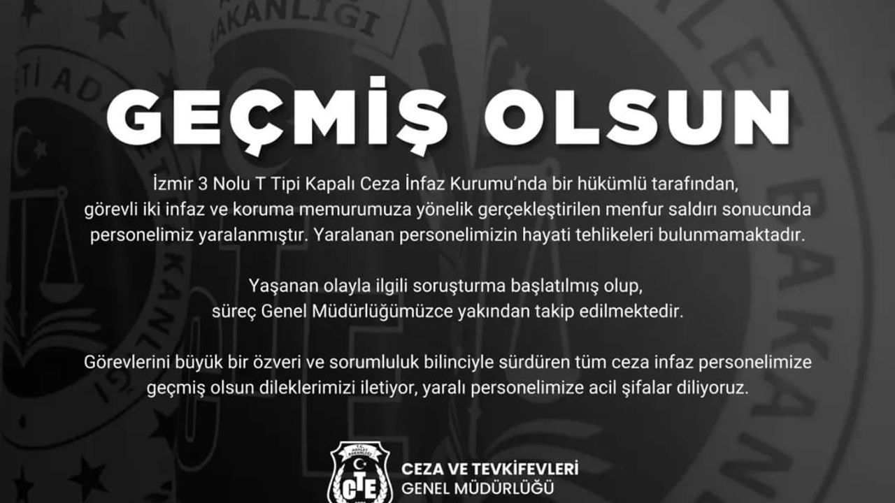 Ceza ve Tevkifevleri Genel Müdürlüğü (CTE), İzmir 3 No'lu T Tipi Kapalı Ceza İnfaz Kurumu'nda bir hükümlünün saldırısı sonucu görevli 2 infaz ve koruma memurunun yaralandığını kaydetti. Genel Müdürlükten sanal medyada yapılan açıklamada, 'İzmir 3 Nolu T Tipi Kapalı Ceza İnfaz Kurumunda bir hükümlü tarafından, görevli iki infaz ve koruma memurumuza yönelik gerçekleştirilen menfur saldırı sonucunda personelimiz yaralanmıştı. Yaralanan personelimizin hayati tehlikeleri bulunmamaktadır. Yaşanan olayla ilgili soruşturma başlatılmış olup, süreç Genel Müdürlüğümüzce yakından takip edilmektedir. Görevlerini büyük bir özveri ve sorumluluk bilinciyle sürdüren tüm ceza infaz personelimize geçmiş olsun dileklerimizi iletiyor, yaralı personelimize acil şifalar diliyoruz.' ifadeleri kullanıldı.