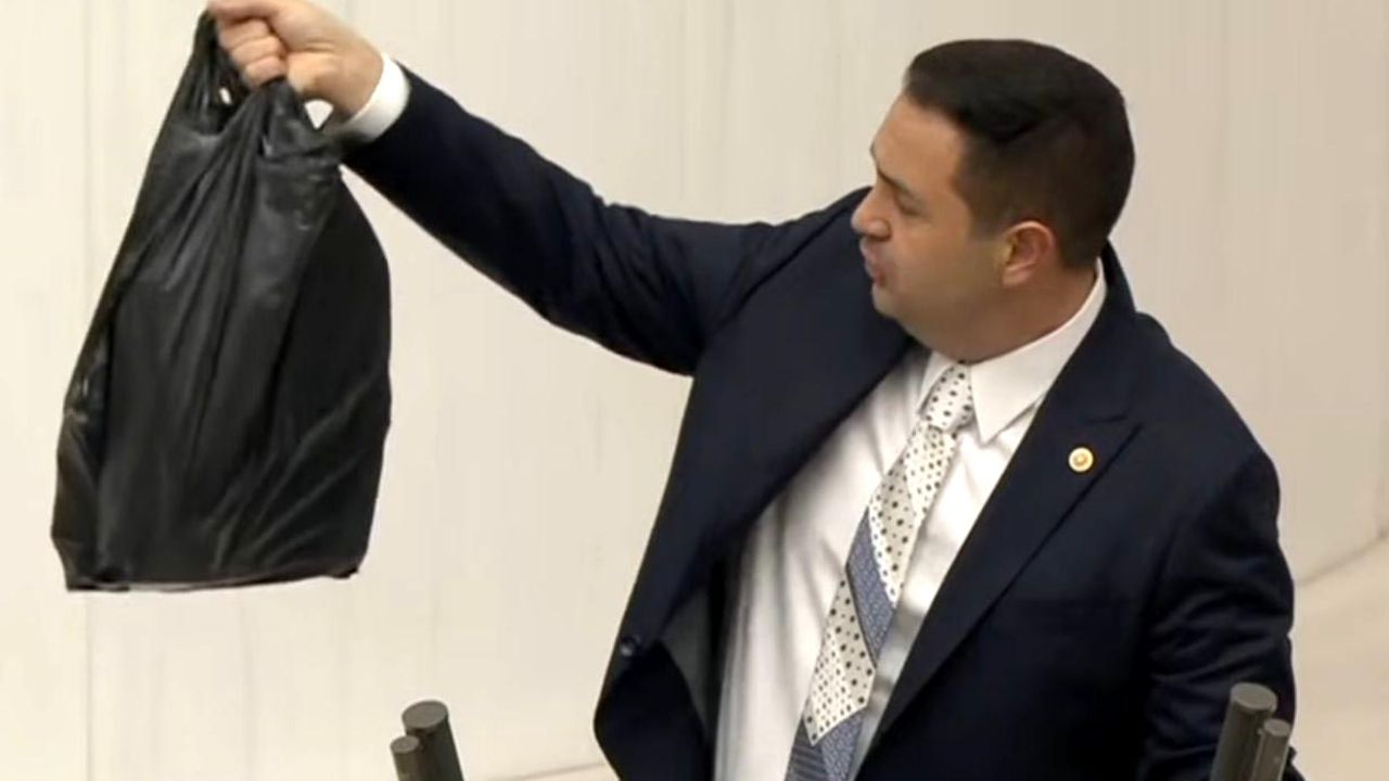 Sonrasında siyasi partilerin TBMM Başkanlığına sunduğu önergeler üzerine görüşmelere başlandı. Bu bölümde CHP, 'Ülkemizin en büyük sorunlarından olan yolsuzluğun sebeplerinin araştırılması ve çözüm yollarının belirlenmesi' başlıklı önergeyi sundu. Önergenin gerekçesini açıklamak üzere kürsüye çıkan CHP Ankara Milletvekili Umut Akdoğan, "Bugün, kürsüye bu siyah poşetle geldim, siyah poşet tercih ettim çünkü içinde ayıplı şeyler var, Aziz İhsan Aktaş iddianamesi bu poşetin içinde. 4 cilt şeklinde bulunuyor ve bu yüzden siyah poşetle getirme zorunluluğu doğdu. Bu poşetin içinde ne var biliyor musunuz? Bu poşetin içinde kanıta dayandırılamayan gizli tanık ifadeleri var. Bu poşetin içinde, 'XYZ49QP' diye bir gizli tanığın sözleri var. Hiçbir kanıta dayandırılamamasına rağmen bu kadar bir iddianame oluşturulmuş. Bu iddianamenin dayandırıldığı yer bir çete, çetenin reisi sokakta dolaşıyor; ama iftira atılan kişiler cezaevinde yatıyor" diye konuştu.
