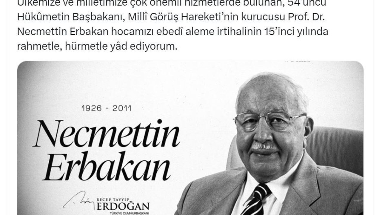 Cumhurbaşkanı ı Recep Tayyip Erdoğan, sanal medya hesabından paylaştığı mesajda, "Ülkemize ve milletimize çok önemli hizmetlerde bulunan, 54'üncü Hükümetin Başbakanı, Milli Görüş Hareketi'nin kurucusu Prof. Dr. Necmettin Erbakan hocamızı ebedi aleme irtihalinin 15'inci yılında rahmetle, hürmetle yad ediyorum" sözlerine yer verdi.