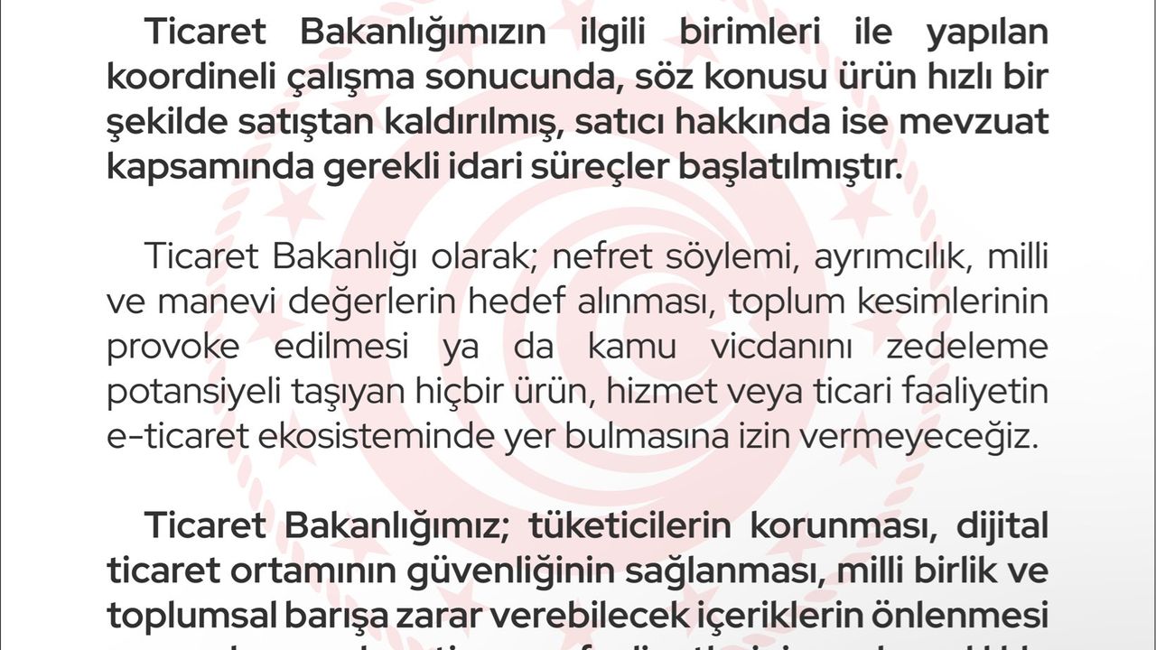 Bakanlığın sosyal medya hesabından yapılan açıklamada, "Bir e-ticaret platformunda, toplumumuzun inanç ve değerlerini hedef alan ürünlerin satışa sunulduğuna ilişkin kamuoyuna yansıyan paylaşımlar üzerine Ticaret Bakanlığımızca derhal inceleme başlatılmıştır. Ticaret Bakanlığımızın ilgili birimleri ile yapılan koordineli çalışma sonucunda, söz konusu ürün hızlı bir şekilde satıştan kaldırılmış, satıcı hakkında ise mevzuat kapsamında gerekli idari süreçler başlatılmıştır. Ticaret Bakanlığı olarak; nefret söylemi, ayrımcılık, milli ve manevi değerlerin hedef alınması, toplum kesimlerinin provoke edilmesi ya da kamu vicdanını zedeleme potansiyeli taşıyan hiçbir ürün, hizmet veya ticari faaliyetin e-ticaret ekosisteminde yer bulmasına izin vermeyeceğiz. Ticaret Bakanlığımız; tüketicilerin korunması, dijital ticaret ortamının güvenliğinin sağlanması, milli birlik ve toplumsal barışa zarar verebilecek içeriklerin önlenmesi amacıyla denetim faaliyetlerini kararlılıkla sürdürmektedir. Kamu düzenini zedeleyici her türlü ticari faaliyete karşı gerekli tüm adımlar, hiçbir gecikmeye mahal verilmeden atılacaktır" denildi.