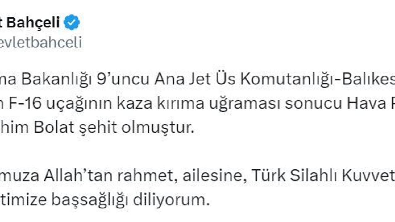 MHP Genel Başkanı Devlet Bahçeli, Balıkesir'den kalkış yapan F-16 uçağının kaza kırıma uğraması sonucu şehit olan Hava Pilot Binbaşı İbrahim Bolat için taziye mesajı yayımladı.