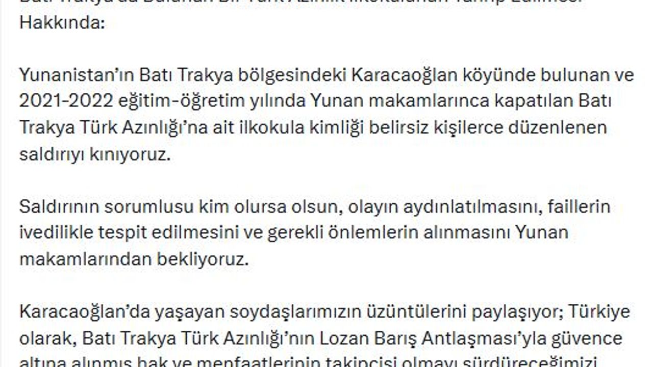 Dışişleri Sözcüsü Keçeli, sosyal medya hesabı üzerinden yaptığı açıklamada, Türk okuluna yapılan saldırıyı kınayarak "Yunanistan'ın Batı Trakya bölgesindeki Karacaoğlan köyünde bulunan ve 2021-2022 eğitim öğretim yılında Yunan makamlarınca kapatılan Batı Trakya Türk azınlığına ait ilkokula kimliği belirsiz kişilerce düzenlenen saldırıyı kınıyoruz. Saldırının sorumlusu kim olursa olsun, olayın aydınlatılmasını, faillerin ivedilikle tespit edilmesini ve gerekli önlemlerin alınmasını Yunan makamlarından bekliyoruz. Karacaoğlan'da yaşayan soydaşlarımızın üzüntülerini paylaşıyor; Türkiye olarak, Batı Trakya Türk azınlığının Lozan Barış Antlaşması'yla güvence altına alınmış hak ve menfaatlerinin takipçisi olmayı sürdüreceğimizi vurguluyoruz" ifadelerini kullandı.
