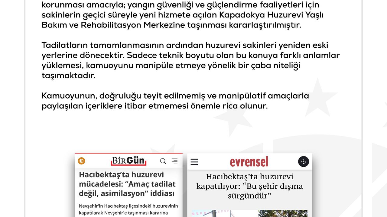 DMM'nin sosyal medya hesabından yapılan açıklamada, "Bazı basın ve yayın organlarında, Nevşehir’de bir huzurevinin tadilat gerekçesiyle kapatılmasının Bektaşi kültürünü zayıflatmaya yönelik bir adım olduğu yönünde yer alan iddialar asılsız olup, kamuoyunu yanıltmaya yönelik dezenformasyon içermektedir. Söz konusu huzurevinde kalan yaşlılarımızın can ve mal güvenliğinin korunması amacıyla; yangın güvenliği ve güçlendirme faaliyetleri için sakinlerin geçici süreyle yeni hizmete açılan Kapadokya Huzurevi Yaşlı Bakım ve Rehabilitasyon Merkezine taşınması kararlaştırılmıştır. Tadilatların tamamlanmasının ardından huzurevi sakinleri yeniden eski yerlerine dönecektir. Sadece teknik boyutu olan bu konuya farklı anlamlar yüklemesi, kamuoyunu manipüle etmeye yönelik bir çaba niteliği taşımaktadır. Kamuoyunun, doğruluğu teyit edilmemiş ve manipülatif amaçlarla paylaşılan içeriklere itibar etmemesi önemle rica olunur" ifadelerine yer verildi.