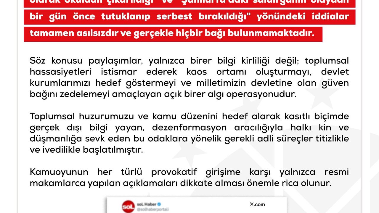 DMM'nin sosyal medya hesabından yapılan paylaşımda, 'Bazı basın yayın organları ve sosyal medya platformları üzerinden Kahramanmaraş ve Şanlıurfa'da yaşanan elim hadiselere ilişkin paylaşılan; 'Kahramanmaraş'taki saldırganın polis eşliğinde sağ olarak okuldan çıkarıldığı' ve 'Şanlıurfa'daki saldırganın olaydan bir gün önce tutuklanıp serbest bırakıldığı' yönündeki iddialar tamamen asılsızdır ve gerçekle hiçbir bağı bulunmamaktadır. Söz konusu paylaşımlar, yalnızca birer bilgi kirliliği değil; toplumsal hassasiyetleri istismar ederek kaos ortamı oluşturmayı, devlet kurumlarımızı hedef göstermeyi ve milletimizin devletine olan güven bağını zedelemeyi amaçlayan açık birer algı operasyonudur. Toplumsal huzurumuzu ve kamu düzenini hedef alarak kasıtlı biçimde gerçek dışı bilgi yayan, dezenformasyon aracılığıyla halkı kin ve düşmanlığa sevk eden bu odaklara yönelik gerekli adli süreçler titizlikle ve ivedilikle başlatılmıştır. Kamuoyunun her türlü provokatif girişime karşı yalnızca resmi makamlarca yapılan açıklamaları dikkate alması önemle rica olunur' denildi.