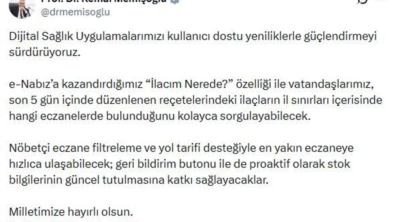 Bakan Memişoğlu, sosyal medya hesabından yaptığı paylaşımda, 'Dijital Sağlık Uygulamalarımızı kullanıcı dostu yeniliklerle güçlendirmeyi sürdürüyoruz. e-Nabız'a kazandırdığımız 'İlacım Nerede?' özelliği ile vatandaşlarımız, son 5 gün içinde düzenlenen reçetelerindeki ilaçların il sınırları içerisinde hangi eczanelerde bulunduğunu kolayca sorgulayabilecek. Nöbetçi eczane filtreleme ve yol tarifi desteğiyle en yakın eczaneye hızlıca ulaşabilecek; geri bildirim butonu ile de proaktif olarak stok bilgilerinin güncel tutulmasına katkı sağlayacaklar. Milletimize hayırlı olsun' dedi.
