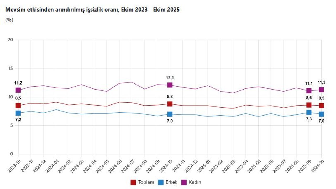 TÜİK, Ekim 2025 dönemine ilişkin iş gücü istatistiklerini açıkladı. Buna göre; 15 ve daha yukarı yaştaki kişilerde işsiz sayısı 2025 yılı Ekim ayında bir önceki aya göre 27 bin kişi azalarak 3 milyon 33 bin kişi oldu. İşsizlik oranı 0,1 puan azalarak yüzde 8,5 seviyesinde gerçekleşti. İşsizlik oranı erkeklerde yüzde 7 iken kadınlarda yüzde 11,3 kaydedildi. İstihdam edilenlerin sayısı 2025 yılı Ekim ayında bir önceki aya göre 185 bin kişi artarak 32 milyon 772 bin kişi, istihdam oranı 0,2 puan artarak yüzde 49,2 oldu. Bu oran erkeklerde yüzde 66,5 iken kadınlarda yüzde 32,4 olarak gerçekleşti. İş gücü, 2025 yılı Ekim ayında bir önceki aya göre 157 bin kişi artarak 35 milyon 804 bin kişi, iş gücüne katılma oranı ise 0,2 puan artarak yüzde 53,8 olarak gerçekleşti. İş gücüne katılma oranı erkeklerde yüzde 71,5 iken kadınlarda yüzde 36,5 oldu.
