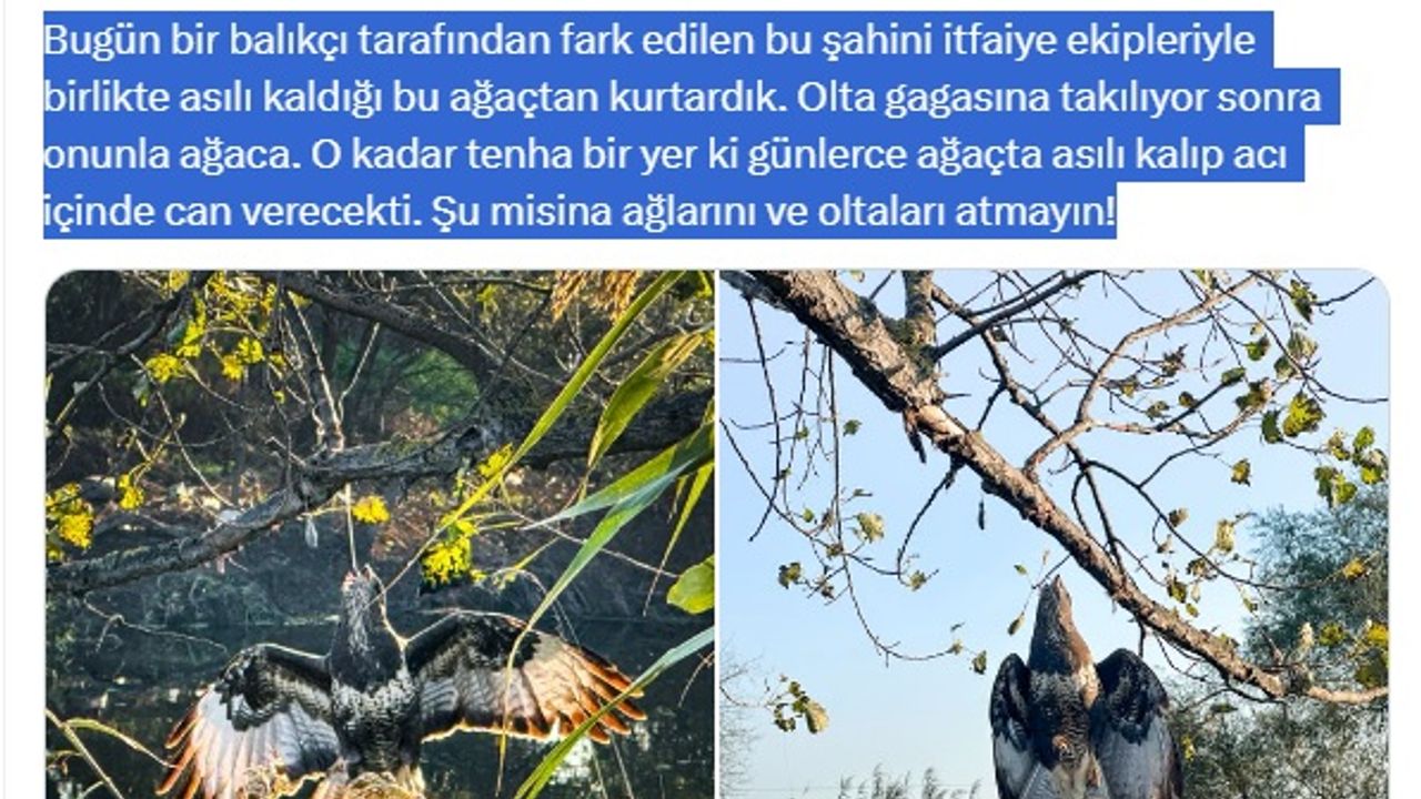 Ekipler ile birlikte olay yerine giden doğa fotoğrafçısı Alper Tüydeş, sosyal medya hesabından şahinin oltaya takılı fotoğrafını paylaşıp, "Bugün bir balıkçı tarafından fark edilen bu şahini itfaiye ekipleriyle birlikte asılı kaldığı bu ağaçtan kurtardık. Olta gagasına takılıyor sonra onunla ağaca. O kadar tenha bir yer ki günlerce ağaçta asılı kalıp acı içinde can verecekti. Şu misina ağlarını ve oltaları atmayın" dedi.
