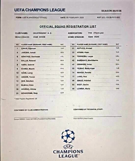 Öte yandan Galatasaray’ın yeni transferlerinden Yaser Asprilla ve Can Armando Güner, UEFA’ya verilen güncellenmiş Şampiyonlar Ligi listesine dahil edilmedi.