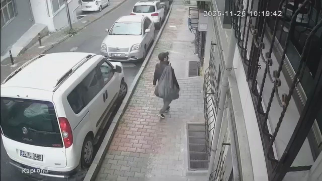 Gaziosmanpaşa'da apartmanlara giren şüpheli, katları tek tek dolaşıp daire önlerindeki ayakkabıları siyah poşete doldurarak çaldı. O anlar apartmanların güvenlik kameralarına takıldı.