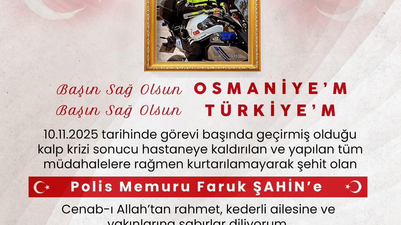 Osmaniye İl Emniyet Müdürlüğü tarafından paylaşılan başsağlığı mesajında, “10 Kasım günü Trafik Tescil ve Denetleme Şube Müdürlüğümüz kadrosunda görevli meslektaşımız polis memuru Faruk Şahin, görevi esnasında geçirdiği kalp krizi sonucu hastaneye kaldırılmış ve yapılan tüm müdahalelere rağmen kurtarılamayarak şehit olmuştur. Kahraman şehidimize Allah'tan rahmet, yakınlarına ve milletimize başsağlığı dileriz” ifadeleri kullanıldı..