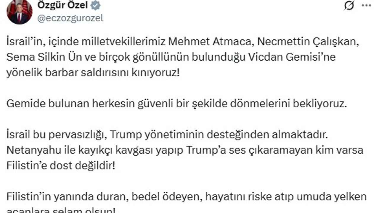 CHP Genel Başkanı Özel, İsrail'in Filistin'e doğru yola çıkan Vicdan Gemisi'ne yönelik saldırına dar sosyal medya hesabından açıklama yaptı. Özel, "İsrail'in, içinde milletvekillerimiz Mehmet Atmaca, Necmettin Çalışkan, Sema Silkin Ün ve birçok gönüllünün bulunduğu Vicdan Gemisi'ne yönelik barbar saldırısını kınıyoruz. Gemide bulunan herkesin güvenli bir şekilde dönmelerini bekliyoruz. İsrail bu pervasızlığı, Trump yönetiminin desteğinden almaktadır. Netanyahu ile kayıkçı kavgası yapıp Trump'a ses çıkaramayan kim varsa Filistin'e dost değildir. Filistin'in yanında duran, bedel ödeyen, hayatını riske atıp umuda yelken açanlara selam olsun" açıklamasında bulundu.