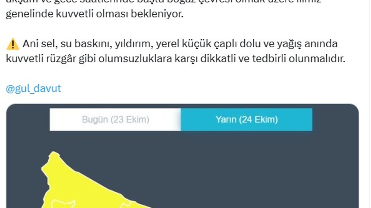 Valiliğin sosyal medya hesabından yayınlanan uyarıda "Meteoroloji Genel Müdürlüğü'nün yaptığı son değerlendirmelere göre, Yarın (Cuma) öğle saatlerinden sonra 'İstanbul'un Avrupa Yakası'ndan' itibaren başlayacak olan gök gürültülü sağanak yağışların, akşam ve gece saatlerinde başta boğaz çevresi olmak üzere ilimiz genelinde kuvvetli olması bekleniyor. Ani sel, su baskını, yıldırım, yerel küçük çaplı dolu ve yağış anında kuvvetli rüzgâr gibi olumsuzluklara karşı dikkatli ve tedbirli olunmalıdır" ifadelerine yer verildi.