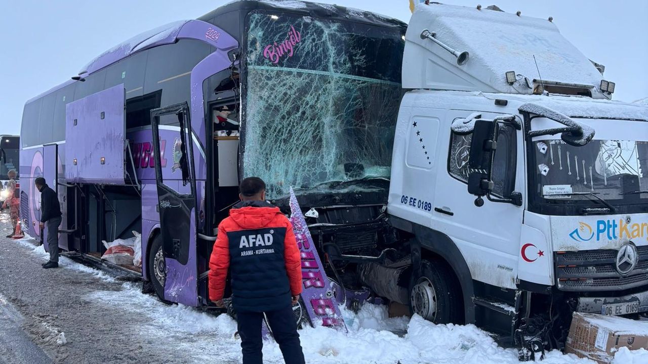 Emre Can A.'nın kullandığı 06 EE 0189 plakalı kargo kamyonu, kar yağışı nedeniyle kayganlaşan yolda kontrolden çıktı. Kamyon refüje çarparak durdu. Bu sırada seyreden Mehmet Zülküf Ç.'nın kullandığı 23 AEV 640 plakalı yolcu otobüsü, kamyona çarptı. Bölgeye, AFAD, sağlık ve jandarma ekipleri sevk edildi. Kazada yaralanan 9 kişi, ambulanslarla çevredeki hastanelere kaldırıldı. Kaza nedeniyle kara yolunda ulaşım kontrollü sağlanıyor.