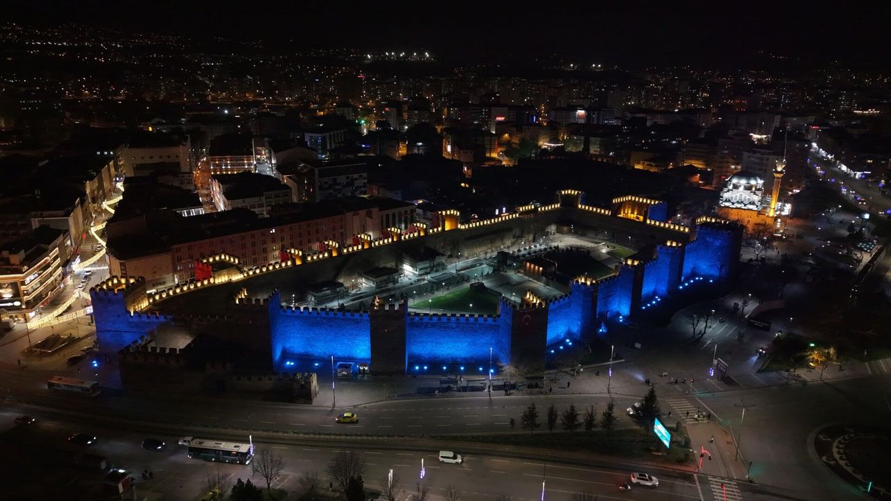 Cumhuriyet Meydanı'ndaki tarihi saat kulesi ve Kayseri Kalesi'nin surları, otizmli bireyleri sakinleştiren, dünyada genel kabul görmüş geleneksel farkındalık rengi olan mavi ışık ile aydınlatıldı.