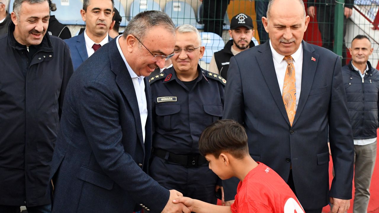 Çocuklar sahaya ellerinde; 'Güvenli Toplum, Güvenlik Gençlik' yazılı pankartla çıktı. Vali Recep Soytürk'ün sembolik başlama vuruşuyla başlayan karşılaşmayı, mahalleliler de tribünlerden izledi.