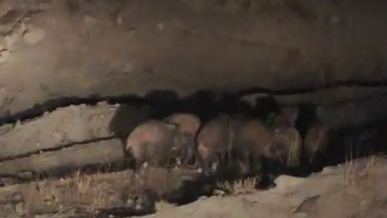 Başkale'ye bağlı Esenyamaç Mahallesi'ne, akşam saatlerinde yaban domuzu sürüsü indi. Mahalle'de yaşayan Mustafa Özdemir, yolun kenarında yiyecek arayan sürüyü, cep telefon kamerasıyla kaydetti. Yaklaşık 10 domuzun bulunduğu sürü, yolun karşısına geçtim gözden kayboldu.