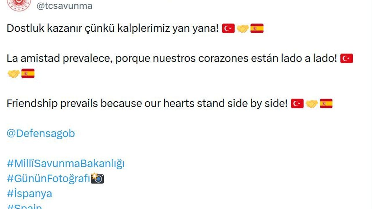 Milli Savunma Bakanlığı (MSB), Almanya'da gerçekleştirilen tatbikatta Türk askeri ile İspanya askerinin çekilen fotoğrafını, 'Dostluk kazanır çünkü kalplerimiz yan yana' notuyla paylaştı.