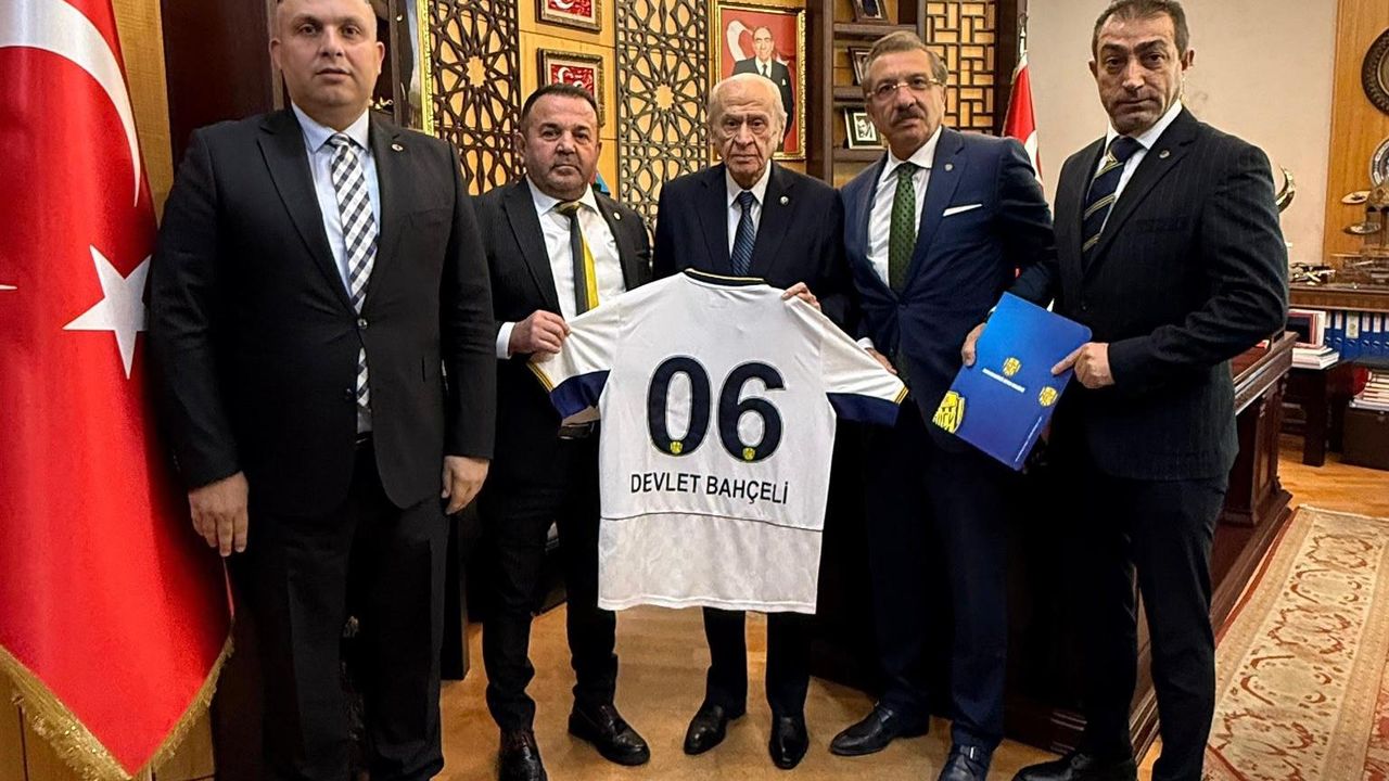 MKE Ankaragücü Kulüp Başkanı Nuri Muhammet Yaman, Başkan ve yönetim kurulu üyeleri ile birlikte Milliyetçi Hareket Partisi Genel Başkanı Devlet Bahçeli'yi makamında ziyaret etti.