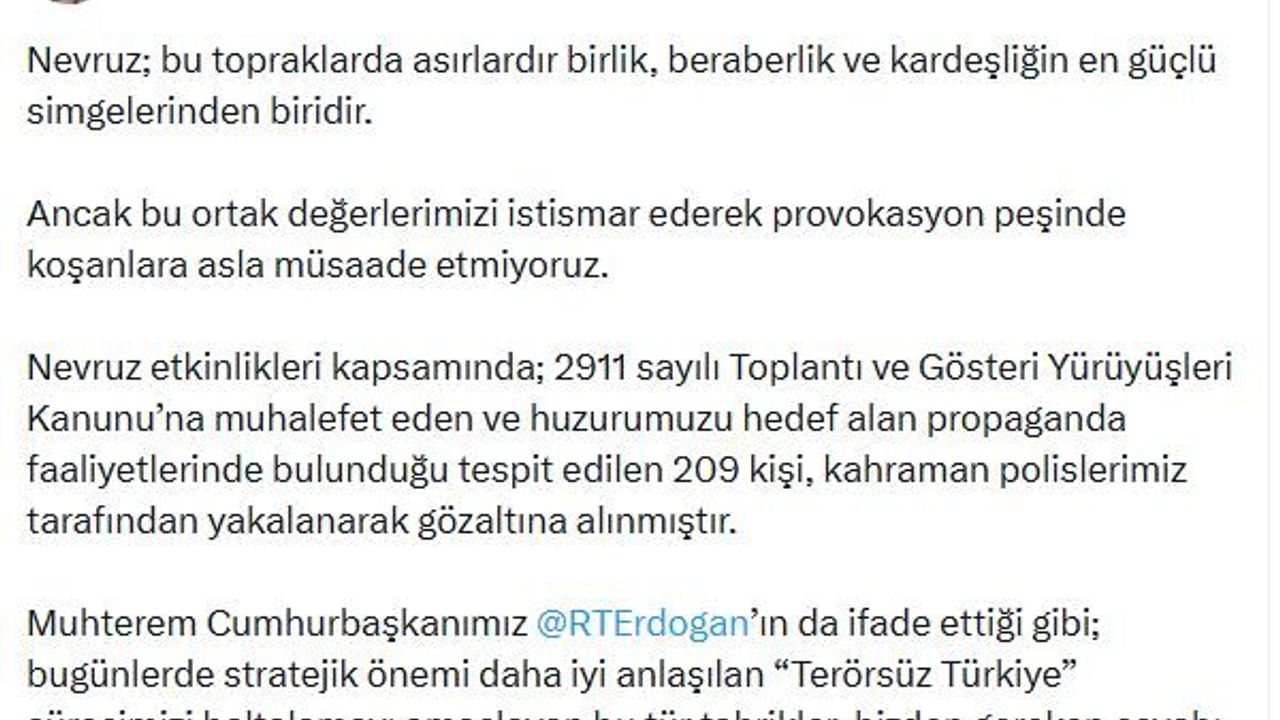 İçişleri Bakanı Mustafa Çiftçi de sosyal medya hesabından yaptığı açıklamada, 'Nevruz; bu topraklarda asırlardır birlik, beraberlik ve kardeşliğin en güçlü simgelerinden biridir. Ancak bu ortak değerlerimizi istismar ederek provokasyon peşinde koşanlara asla müsaade etmiyoruz. Nevruz etkinlikleri kapsamında, 2911 sayılı Toplantı ve Gösteri Yürüyüşleri Kanunu'na muhalefet eden ve huzurumuzu hedef alan propaganda faaliyetlerinde bulunduğu tespit edilen 209 kişi, kahraman polislerimiz tarafından yakalanarak gözaltına alınmıştır. Muhterem Cumhurbaşkanımız Recep Tayyip Erdoğan'ın da ifade ettiği gibi, bugünlerde stratejik önemi daha iyi anlaşılan 'Terörsüz Türkiye' sürecimizi baltalamayı amaçlayan bu tür tahrikler, bizden gereken cevabı mutlaka alacaktır' dedi.