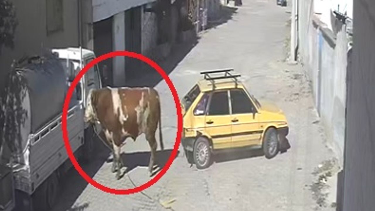 Nevşehir’in Avanos ilçesinde ahırdan kaçan boğa, park halindeki otomobile boynuz darbeleri ile zarar verdi. O anlar güvenlik kamerasına yansıdı.