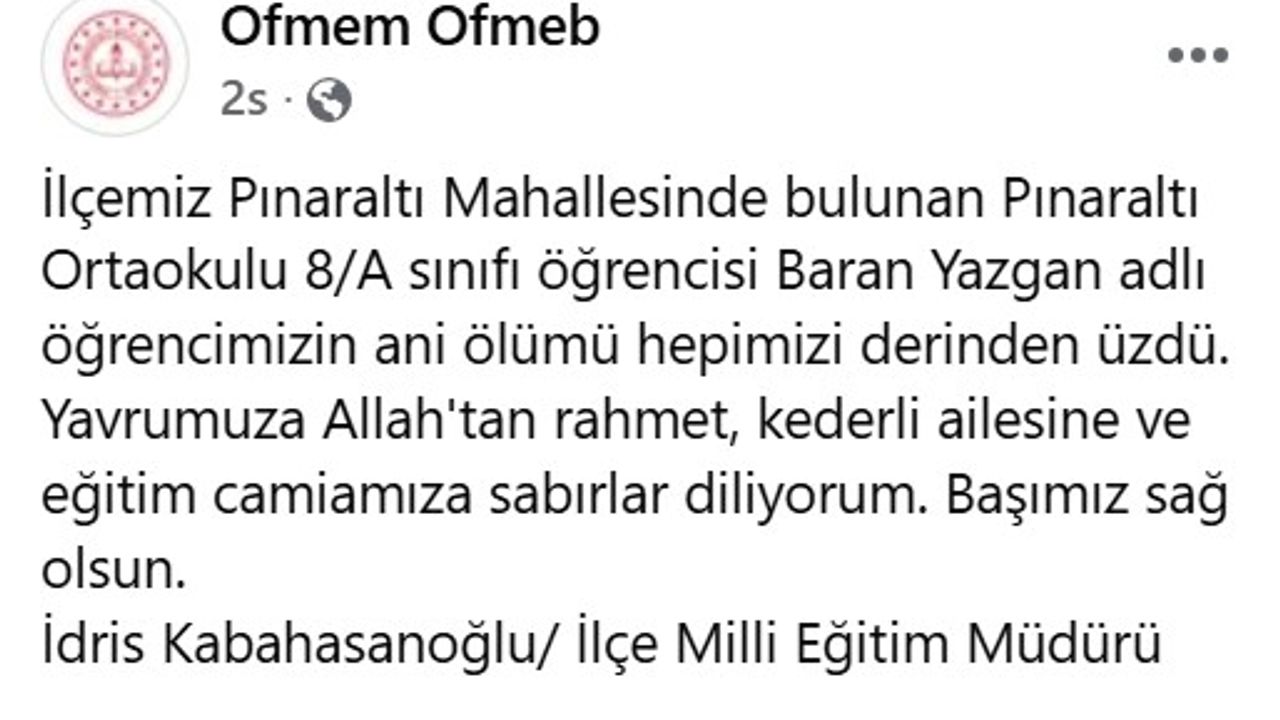 İlçe Milli Eğitim Müdürü İdris Kabahasanoğlu, bir taziye mesajı yayımladı. Sosyal medyada yer alan mesajda, "İlçemiz Pınaraltı Mahallesi’nde bulunan Pınaraltı Ortaokulu 8/A sınıfı öğrencisi Baran Yazgan adlı öğrencimizin ani ölümü hepimizi derinden üzdü. Yavrumuza Allah'tan rahmet, kederli ailesine ve eğitim camiamıza sabırlar diliyorum. Başımız sağ olsun" ifadeleri kullanıldı.