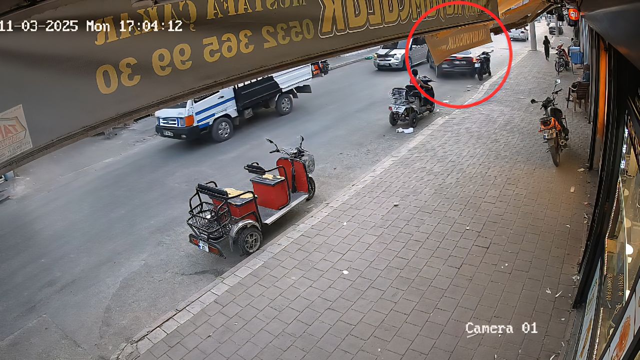 Adana'da sürücüsünün kontrolünden çıkan otomobil, yol kenarında park halindeki motosiklete çarpıp, bir markete girdi. Bu sırada kaldırımda yürüyen bir yayanın kazayı fark edip, saniyelerle ezilmekten kurtulduğu anlar iş yerinin güvenlik kamerasına takıldı.