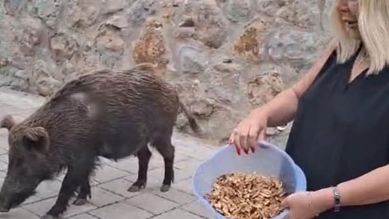 Muğla'nın Bodrum ilçesinde şarkıcı Safiye Soyman, evinin önüne kadar gelen yaban domuzunu ceviz ile besledi. Soyman, o anları sanal medya hesabından paylaştı.