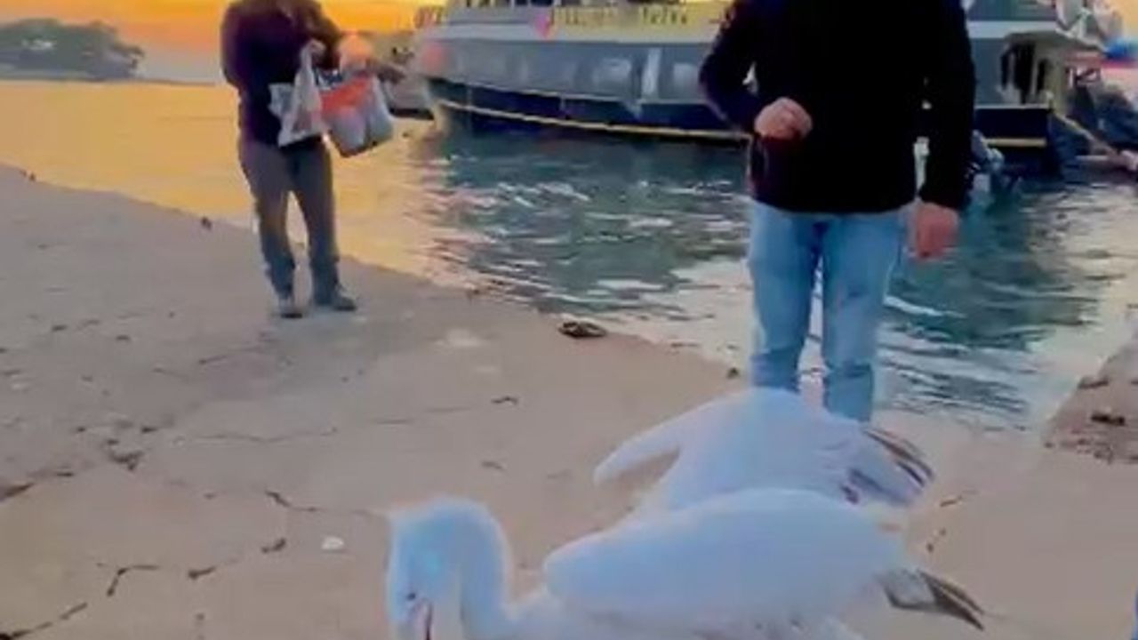 Vatandaşın, "Sinirlenmek yok. Aferin. Kızmak yok, kızmak yok. Öyle sert hareketler yok" diye konuşup, pelikanı karada balık ile beslemeye devam ettiği anlar da görüntüye yansıdı. Pelikan, yere düşen balığı da alıp yedi.