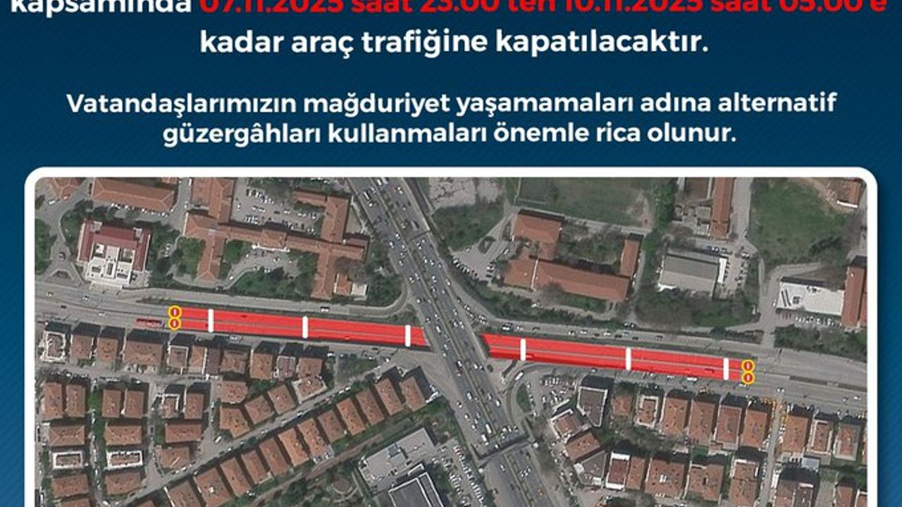 ABB'den yapılan açıklamaya göre, Şehit Ömer Halisdemir Bulvarı, 07 Kasım 2025 Cuma günü saat 23.00’ten itibaren 10 Kasım 2025 Pazartesi günü saat 05.00’e kadar araç trafiğine kapalı olacak.