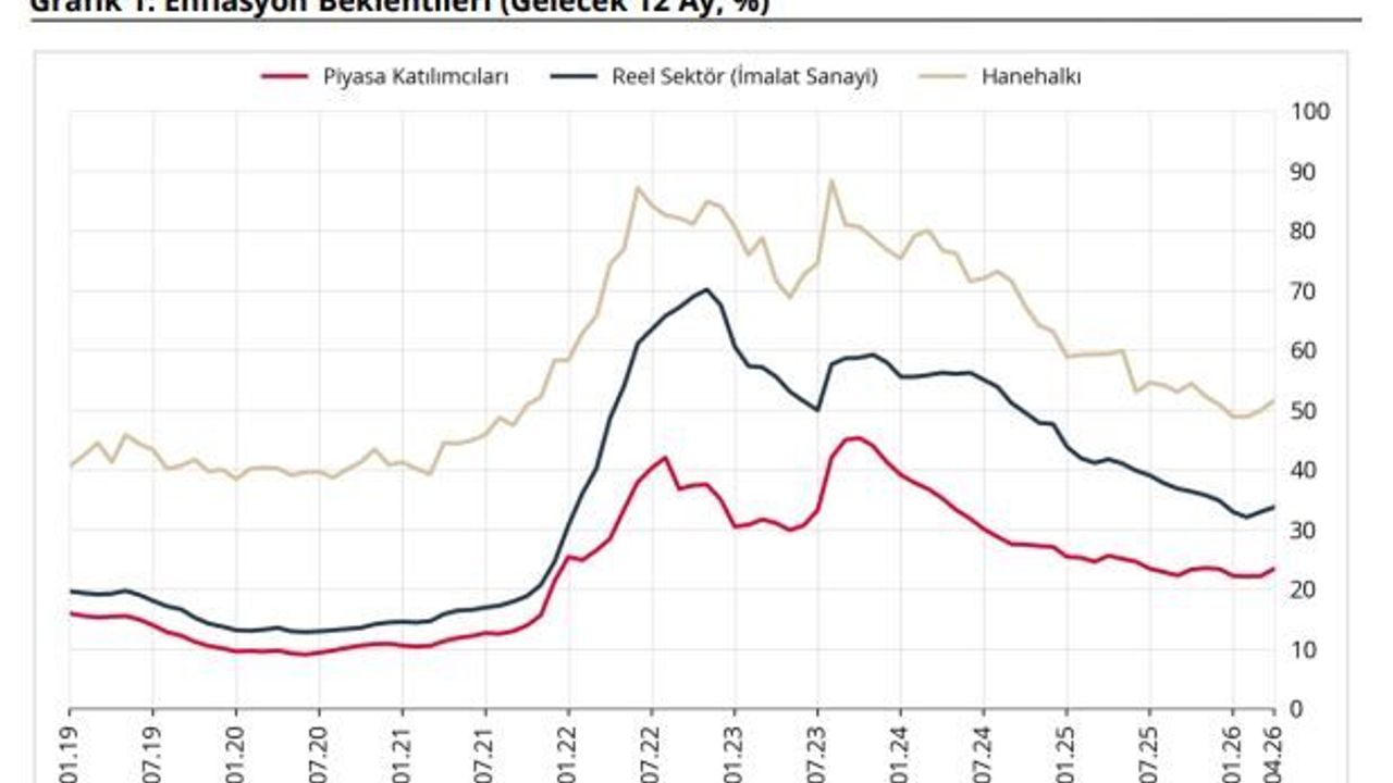 TCMB, Nisan 2026 dönemine dair sektörel enflasyon beklentilerini açıkladı. Buna göre; 12 ay sonrası senelik enflasyon beklentileri bir önceki aya göre, piyasa katılımcıları için 1,22 puan artarak yüzde 23,39 seviyesine, reel sektör için 0,80 puan artarak yüzde 33,70 seviyesine, hanehalkı için 1,67 puan artarak yüzde 51,56 seviyesine çıktı. Gelecek 12 aylık dönemde enflasyonun düşeceğini bekleyen hanehalkı oranı bir önceki aya göre 0,57 puan düşerek yüzde 14,57 seviyesinde gerçekleşti.
