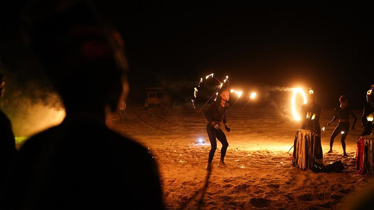 Dakar yakınlarında, Atlas Okyanusu kıyısında gece yarısı düzenlenen gösteride, geleneksel perküsyonlar çalan grup üyelerine ateş cambazları eşlik etti.