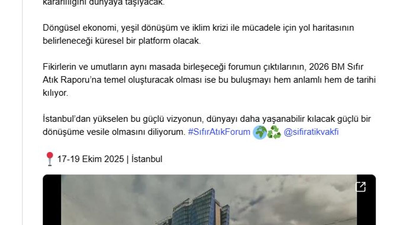 Emine Erdoğan, NSosyal hesabından yaptığı paylaşımda, çevre ve Sıfır Atık konusunda dünyanın en kapsamlı buluşmalarından birine ev sahipliği yapacak olmanın heyecanı ve gururu içerisinde olduklarını aktardı. İstanbul'da Sıfır Atık Vakfı'nın ve Birleşmiş Milletler (BM) iş birliğinde 17-19 Ekim'de yapılacak Sıfır Atık Forumu'nun, 104 ülkeden temsilcileri buluşturarak sürdürülebilir bir gelecek için ortak çözümler arayacağını aktaran Erdoğan, "'İnsan, Mekan, Dönüşüm' temasıyla gerçekleşecek forum, Türkiye'nin Sıfır Atık kararlılığını dünyaya taşıyacak. Döngüsel ekonomi, yeşil dönüşüm ve iklim krizi ile mücadele için yol haritasının belirleneceği küresel bir platform olacak. Fikirlerin ve umutların aynı masada birleşeceği forumun çıktılarının, 2026 BM Sıfır Atık Raporu'na temel oluşturacak olması ise bu buluşmayı hem anlamlı hem de tarihi kılıyor. İstanbul'dan yükselen bu güçlü vizyonun, dünyayı daha yaşanabilir kılacak güçlü bir dönüşüme vesile olmasını diliyorum" dedi.