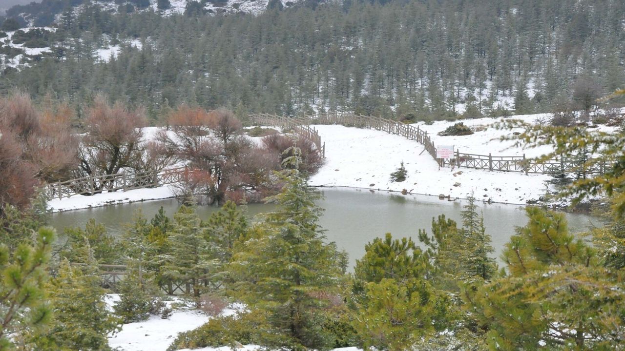 Manisa'da sabah saatlerinde başlayıp, etkisini sürdüren kar yağışı nedeniyle Spil Dağı Milli Parkı, beyaz örtüyle kaplandı.