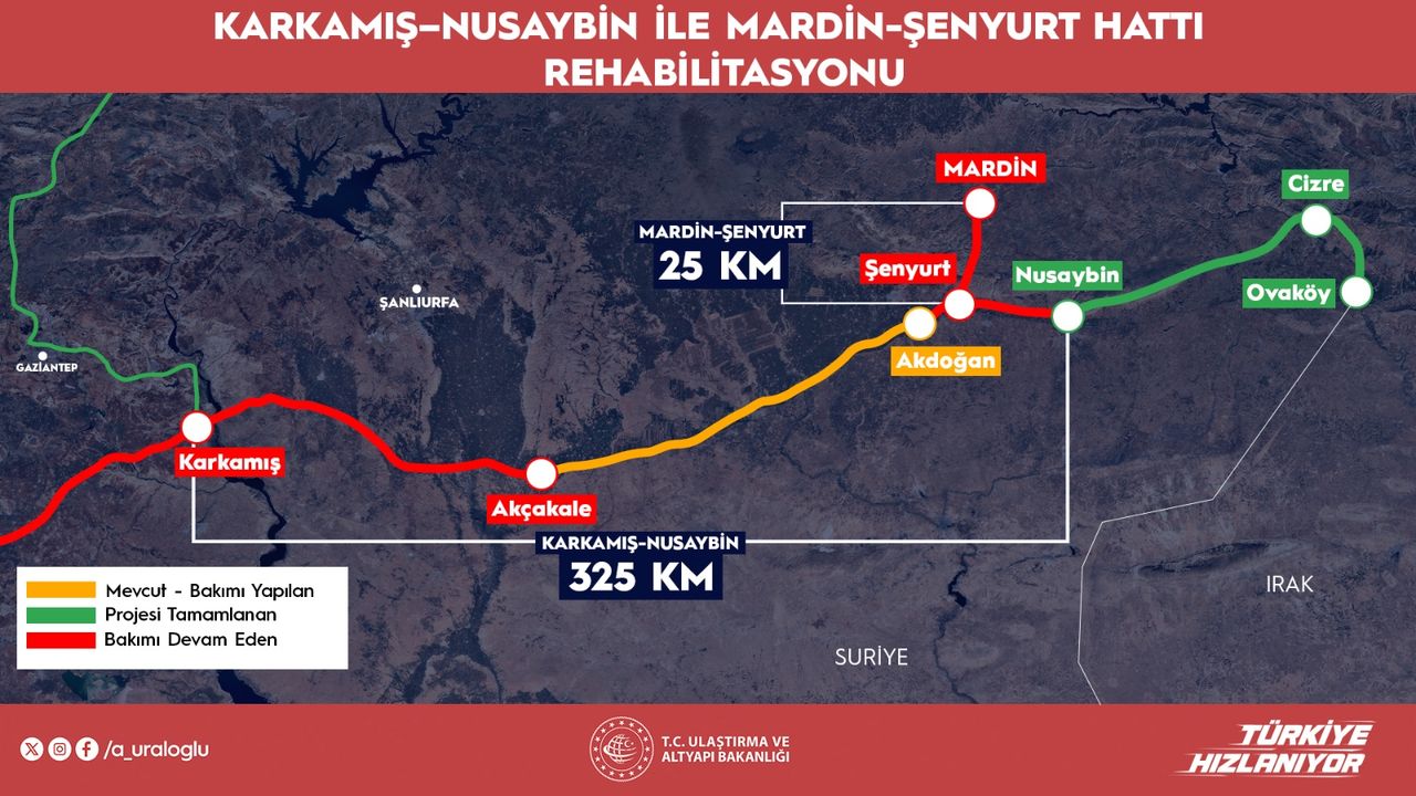 Bakan Uraloğlu, yaptığı yazılı açıklamada, 'Toplam 350 kilometre uzunluğundaki hattın 325 kilometresi Karkamış-Nusaybin, 25 kilometresi ise Mardin-Şenyurt kesiminden oluşuyor. 2011-2024 yılları arasında yapılamayan tüm bakımları tamamlıyor, altyapı ve üstyapı onarımı ile sanat yapıları güçlendirme çalışmalarıyla bölgeye dönük geniş kapsamlı bir planlamayla ele alınıyor. Bölgedeki koşulların normalleşmesiyle birlikte Suriye sınırındaki bu stratejik hattı yeniden ayağa kaldırıyoruz' dedi.
