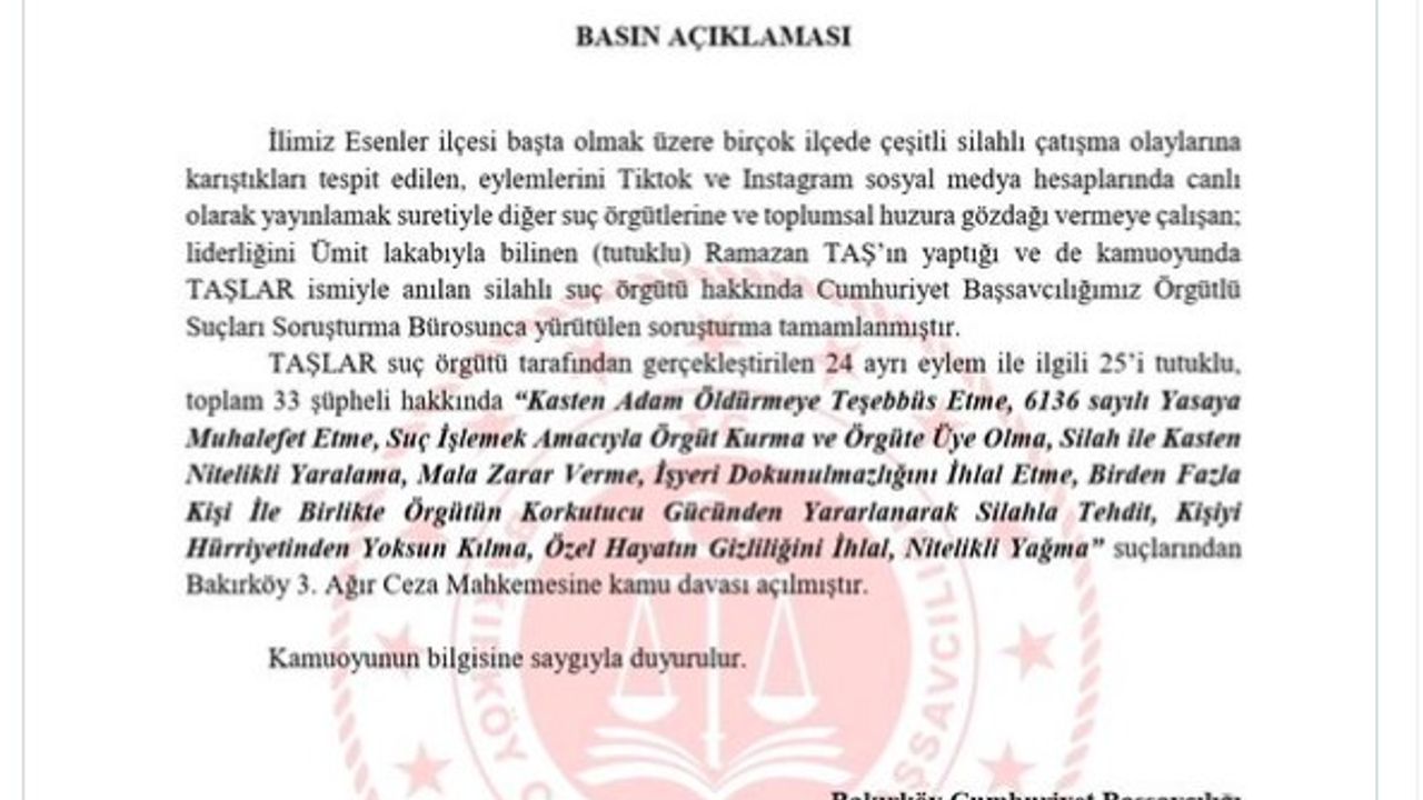 Bakırköy Cumhuriyet Başsavcılığı'nın X hesabından yapılan açıklamada, "İlimiz Esenler ilçesi başta olmak üzere birçok ilçede çeşitli silahlı çatışma olaylarına karıştıkları tespit edilen, eylemlerini Tiktok ve Instagram sosyal medya hesaplarından canlı olarak yayımlamak suretiyle diğer suç örgütlerine ve toplumsal huzura gözdağı vermeye çalışan; liderliğini Ümit lakabıyla bilinen (tutuklu) Ramazan TAŞ'ın yaptığı ve de kamuoyunda TAŞLAR ismiyle anılan silahlı suç örgütü hakkında Cumhuriyet Başsavcılığımız Örgütlü Suçlar Soruşturma Bürosunca yürütülen soruşturma tamamlanmıştır. TAŞLAR suç örgütü tarafından gerçekleştirilen 24 ayrı eylem ile ilgili 25'i tutuklu, toplam 33 şüpheli hakkında "Kasten Adam Öldürmeye Teşebbüs Etme, 6136 sayılı Yasaya Muhalefet Etme, Suç İşlemek Amacıyla Örgüt Kurma ve Örgüte Üye Olma, Silahla Kasten Nitelikli Yaralama, Mala Zarar Verme, İşyerini Dokunulmazlığını İhlal Etme, Birden Fazla Kişi ile Birlikte Örgütün Korkutucu Gücünden Yararlanarak Silahla Tehdit, Kişiyi Hürriyetinden Yoksun Kılma, Özel Hayatın Gizliliğini İhlal, Nitelikli Yağma" suçlarından Bakırköy 3. Ağır Ceza Mahkemesine kamu davası açılmıştır" denildi.