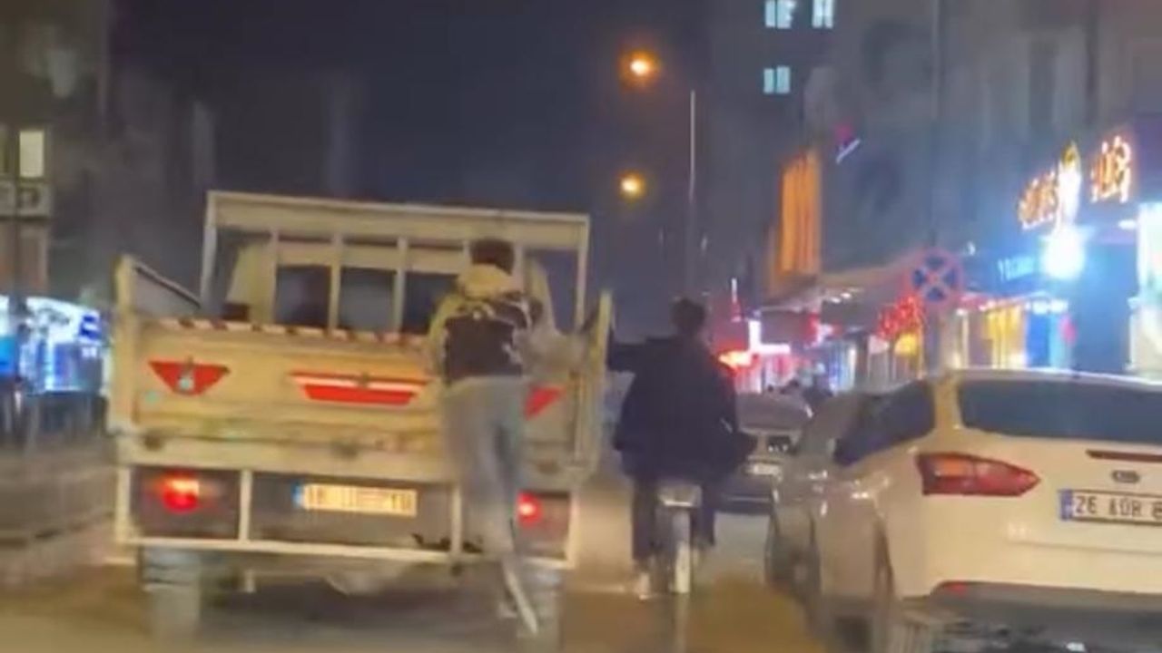 Olay, akşam saatlerinde Yenice Mahallesi Nuri Doğrul Caddesi üzerinde yaşandı. Patenli ve bisikletli iki genç, seyir halinde olan bir kamyonetin arkasına tutunarak bir süre trafikte ilerledi. Trafiği ve kendi can güvenliklerini tehlikeye atan 2 şahıs, bir süre bu şekilde yolculuk etti. O anları gören bir vatandaş ise cep telefonu kamerasıyla tehlikeli yolculuğu kayıt altına aldı. Görüntülerde gençlerin zaman zaman dengesini kaybettiği görüldü, çevredeki sürücüler de duruma tepki gösterdi.