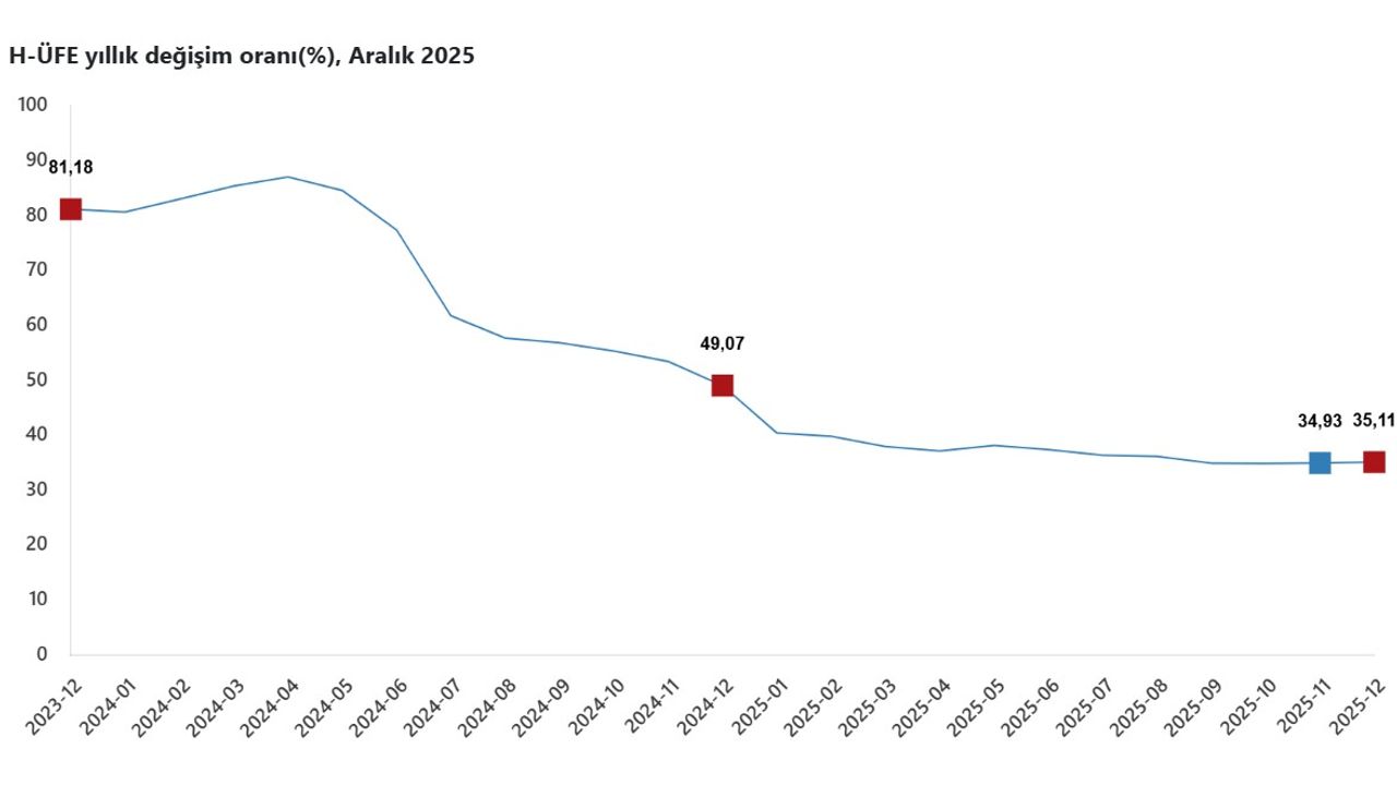 TÜİK, Aralık 2025 dönemine ilişkin hizmet üretici fiyat endeksi verilerini açıkladı. Buna göre hizmet üretici fiyatları bir önceki aya göre yüzde 0,78, bir önceki yılın aralık ayına göre yüzde 35,11, bir önceki yılın aynı ayına göre yüzde 35,11 ve 12 aylık ortalamalara göre yüzde 36,78 arttı.