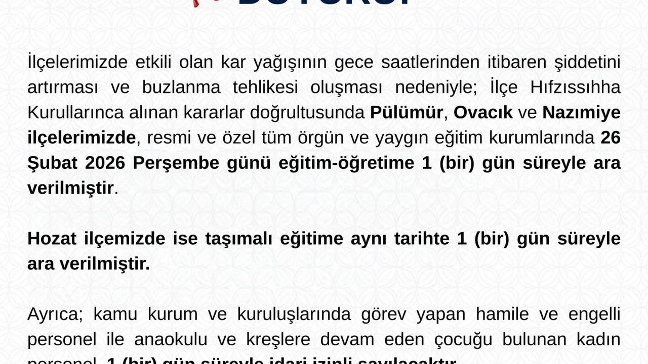 Valilik açıklamasında, 'İlçelerimizde etkili olan kar yağışının gece saatlerinden itibaren şiddetini artırması ve buzlanma tehlikesi oluşması nedeniyle; İlçe Hıfzıssıhha Kurullarınca alınan kararlar doğrultusunda Pülümür, Ovacık ve Nazımiye ilçelerimizde, resmi ve özel tüm örgün ve yaygın eğitim kurumlarında 26 Şubat 2026 Perşembe günü eğitim-öğretime 1 (bir) gün süreyle ara verilmiştir. Hozat ilçemizde ise taşımalı eğitime aynı tarihte 1 (bir) gün süreyle ara verilmiştir. Ayrıca; kamu kurum ve kuruluşlarında görev yapan hamile ve engelli personel ile anaokulu ve kreşlere devam eden çocuğu bulunan kadın personel, 1 (bir) gün süreyle idari izinli sayılacaktır' dedi.